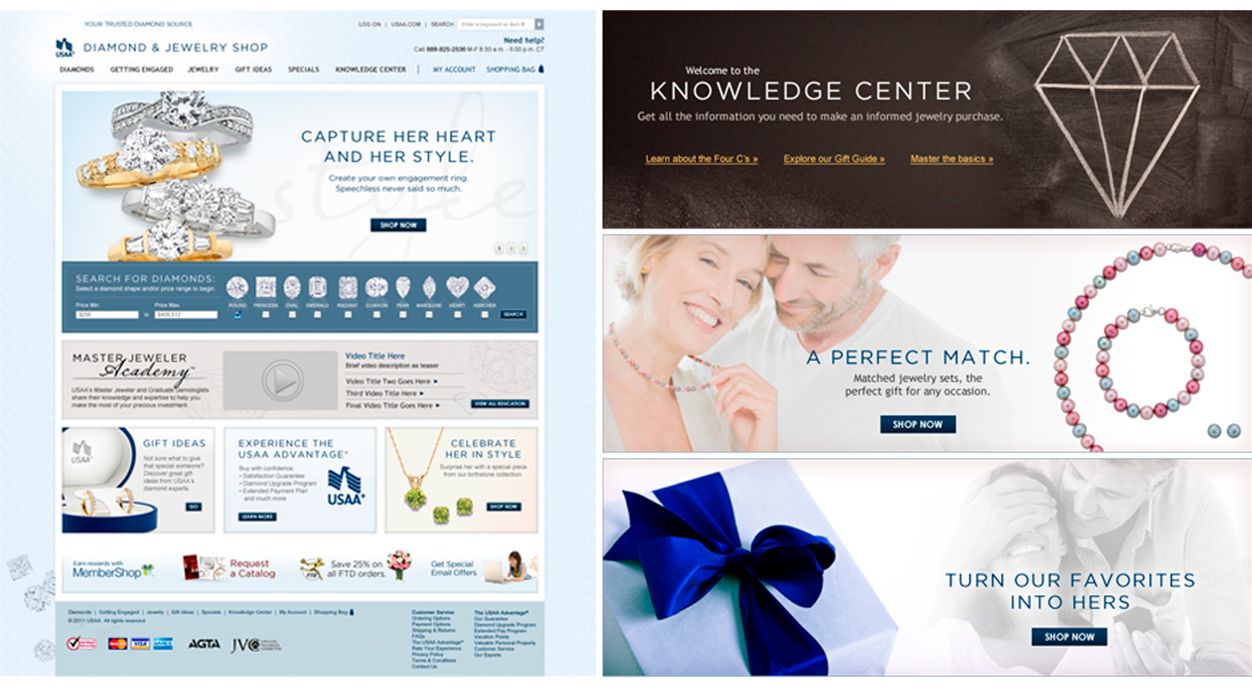 The largest retailer of diamonds online, USAA tapped the Zealista team to create the ultimate interactive shopping experience for their customers — one that not only teaches shoppers how to select select the perfect diamond for their budget; but that also enables them to sort through more than 20,000 diamonds to find the perfect stone, then virtually place it on a setting, to “see” the final piece before purchasing it. The Zealista team provided digital strategy, information architecture, design and front-end development of the new site. We also developed unique educational tools, interactive widgets like diamond sizing and pricing sliders, and a shopping cart/transaction engine that provides iron-clad security, leading to USAA’s continued leadership and financial success in diamond e-commerce.